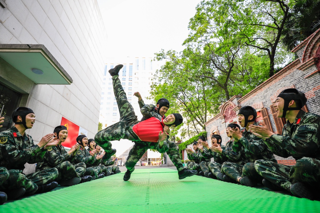 武警上海总队执勤第四支队执勤十中队官兵在营区内开展摔擒训练(2021年4月20日摄)。