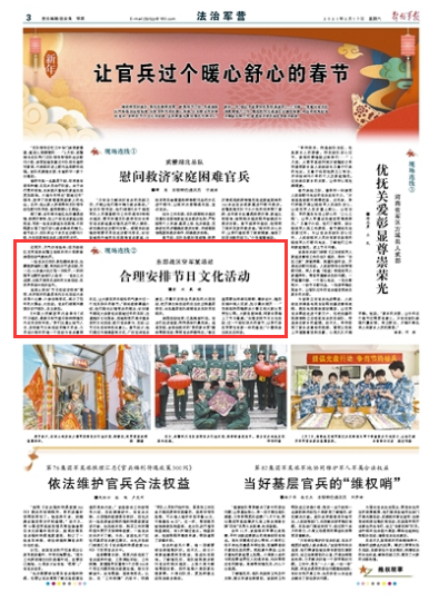 《中国人民解放军内务条令(试行)》规定,星期日和节假日除特殊情况外应当安排休息。“我们注重从细节入手,安排春节文体活动求精不求多,力求设计组织的每一个活动为官兵喜闻乐见,让大家在欢乐轻松的气氛中过一个充实快乐的春节。”场站政委谭磊介绍,他们强化以情带兵的理念,针对春节期间大多数官兵就地过年的实际,注重搞好文化服务,因地制宜开展丰富多彩的文化活动,吸引官兵参与、互动,让节日生活有特色有意义。春节前夕,他们通过问卷调查等方式,广泛征询官兵意见,尽量不安排全员参加的大项活动,把开展文体活动的自主权交给基层单位,由各基层连队根据官兵实际灵活组织。
