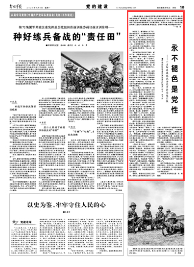回顾自己8年的军旅路,在第4年,我如愿加入党组织,这是一个重要里程碑。这以后,我不仅时刻注重以一名优秀军人的标准要求自己,更经常反思叩问,自己离一名合格党员还有多少差距不足,方方面面都有了进一步的锤炼提升。正如歌词里写的那样,“我把党来比母亲”“党的光辉照我心”。