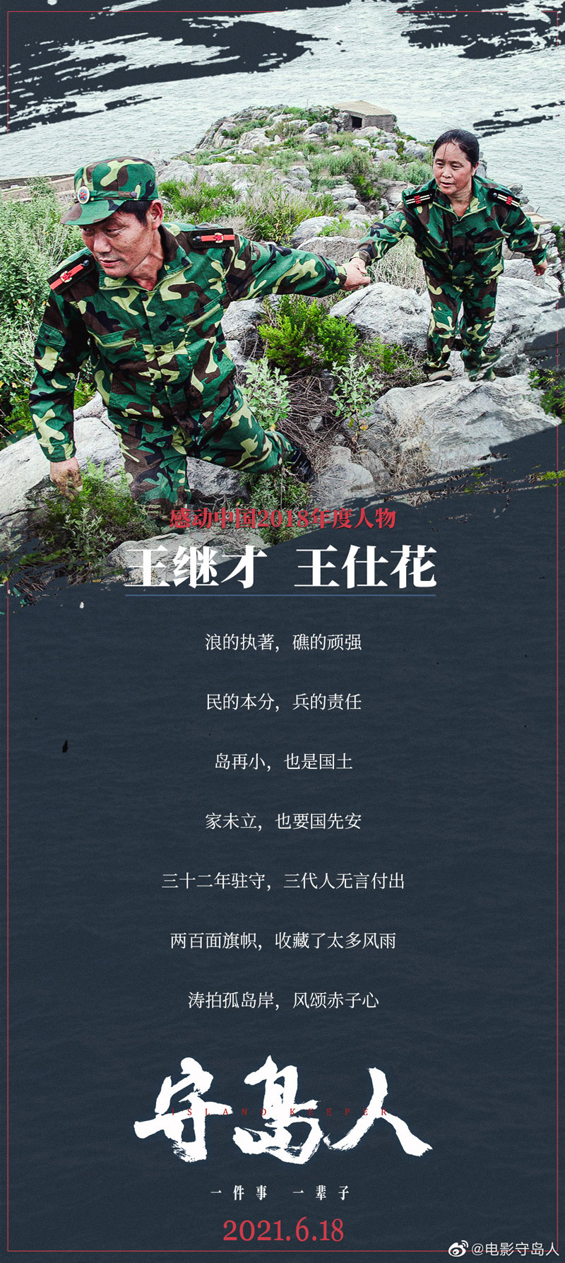 #电影守岛人#定档618!改编自“感动中国2018年度人物”王继才、王仕花真人事迹——浪的执着,礁的顽强,民的本分,兵的责任。岛再小,也是国土;家未立,也要国先安。三十二年驻守,三代人无言付出,两百面旗帜,收藏了太多风雨,涛拍孤岛岸,风颂赤子心!#守岛卫士王继才#