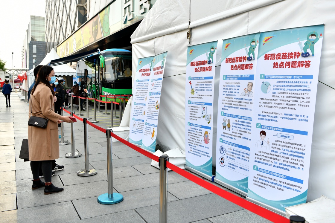 4月7日,在北京西单商业区,行人驻足观看接种点展示的新冠疫苗接种知识宣传海报。