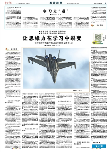 正是基于这种认识,空军指挥学院在教学模式改革中,既重“准备今天的战争”,更重“打赢明天的战争”。他们正努力实现从重教“术”到重传“道”,从教知识技能到教战争基本规律和底层思维能力的转变,通过研究式学习,引导学员跳出原有的思维和系统,尽快形成本能的联合思维、批判思维和战略思维。