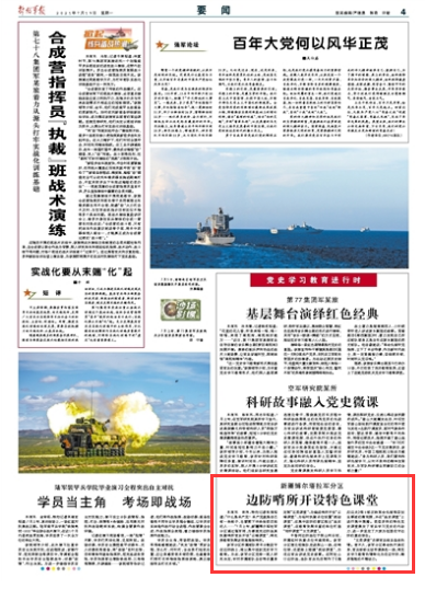 卡昝河边防连位于深山河谷间,所属临时执勤点位未通网络。该军分区理论轻骑队走进深山一线,在哨位旁、巡逻路上搭建“流动课堂”,为戍边官兵讲述党史故事。在阿拉山口边防连,连队官兵先后制作了《魂归边关》等8部反映革命先辈艰苦创业事迹的微视频,并在“连史课堂”上进行集中展播。类型多样的特色党史课堂激发了官兵学习党史的内动力,进一步坚定了大家为祖国戍守边防的意志信念。