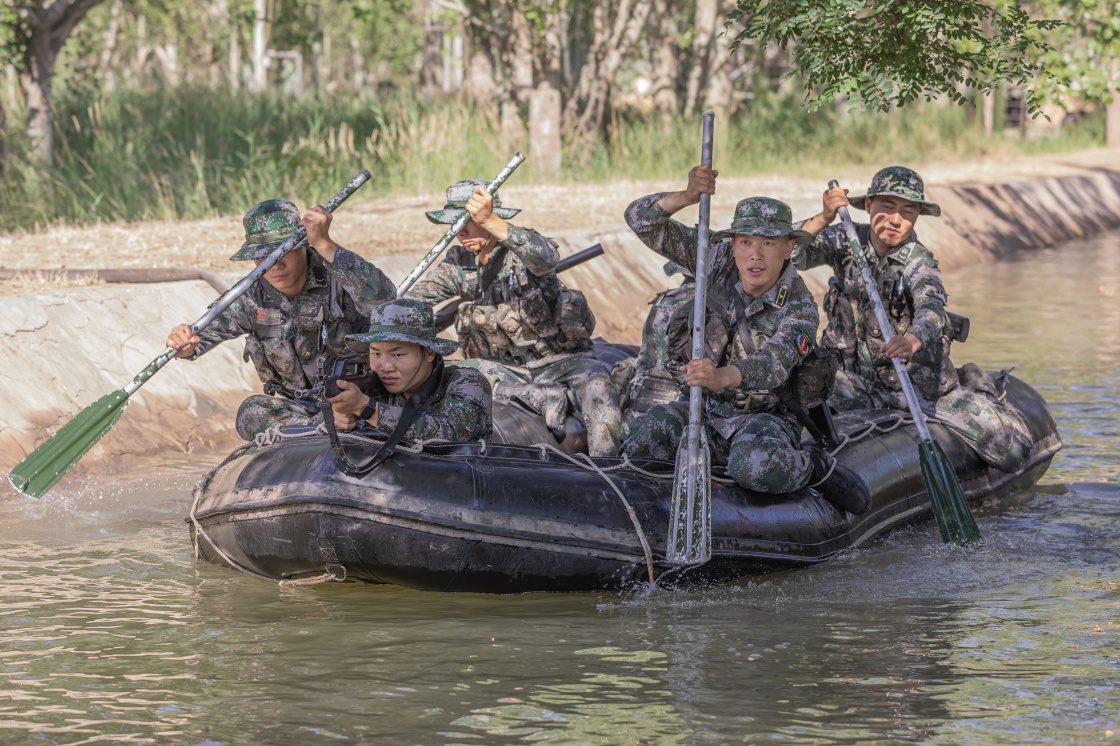 陆军第76集团军某特战旅特战营营长刘近(右二)带领特战小队武装泅渡(7月9日摄)。新华社发(陈浩 摄)