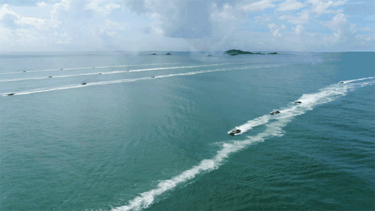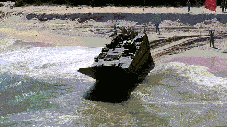 粤东某海域,两栖装甲装备登陆作战综合演练中,一辆战车突然冲出编队,迅即加速。