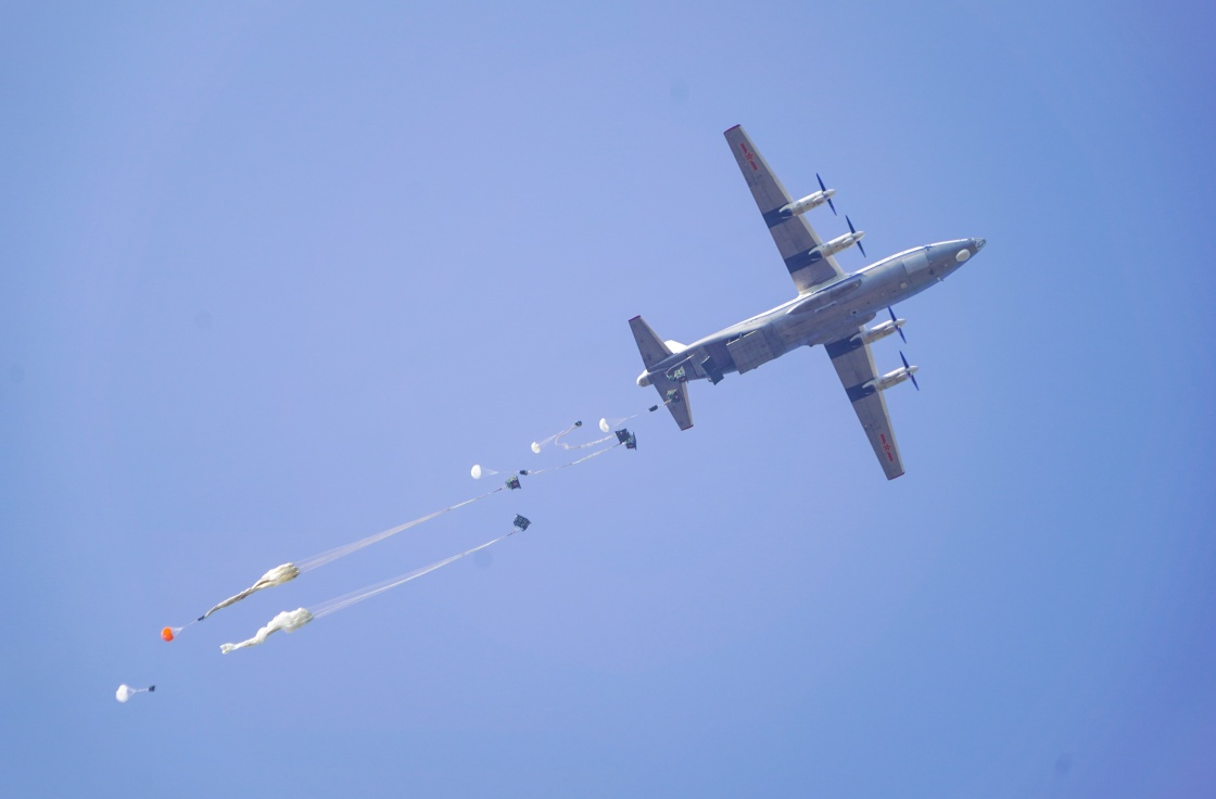 空降兵部队某旅组织大规模集群空降空投训练,数件武器装备脱离机舱(9月8日摄)。新华社发