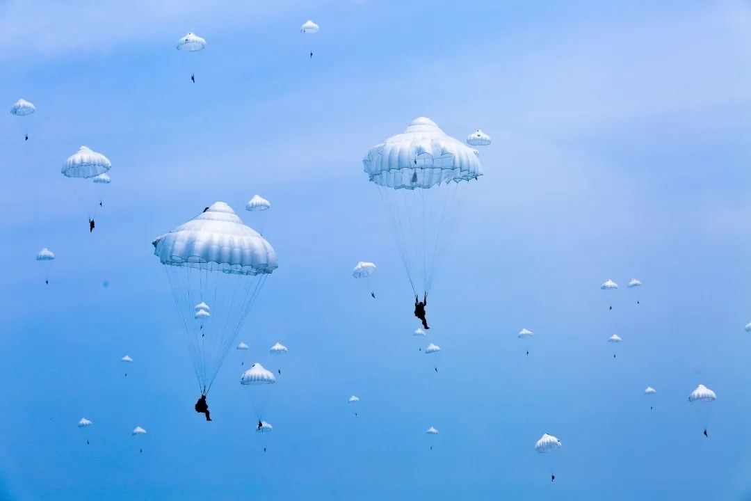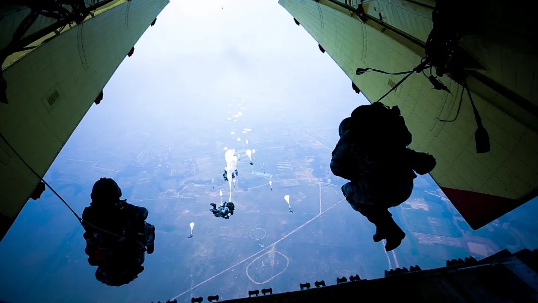 “跳!”绿灯亮,伞训教练的指令穿透风声和飞机轰鸣声传来,余海龙应声一跃,第一个跳出了机舱。其余官兵紧随其后,一朵朵伞花在蓝天绽放。