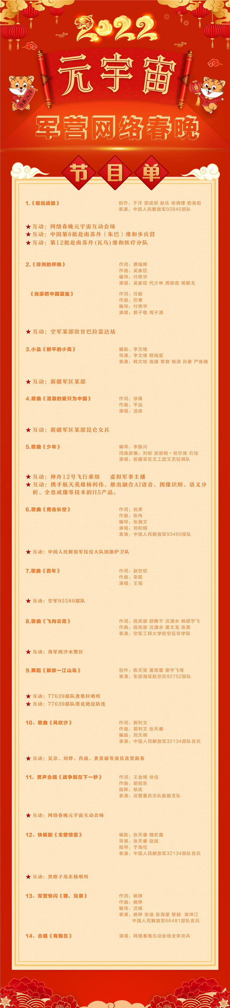 大年初一下午15点,元宇宙军营网络春晚即将播出。节目单新鲜出炉↓↓收藏,一起期待!