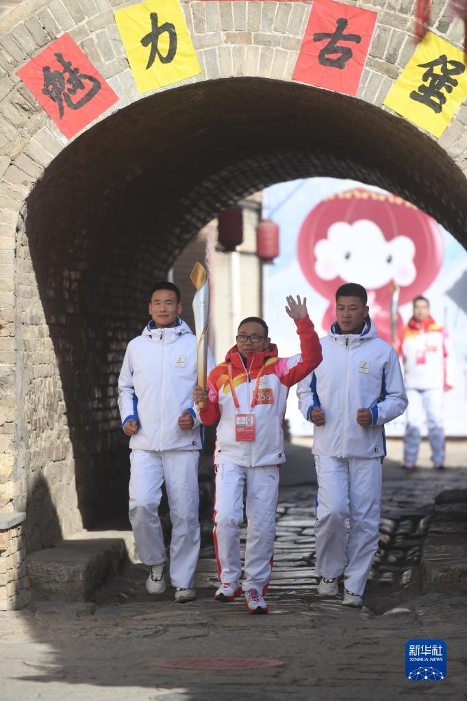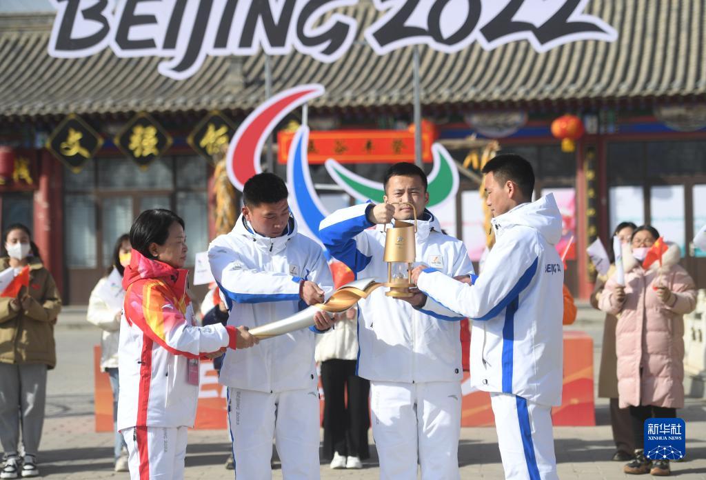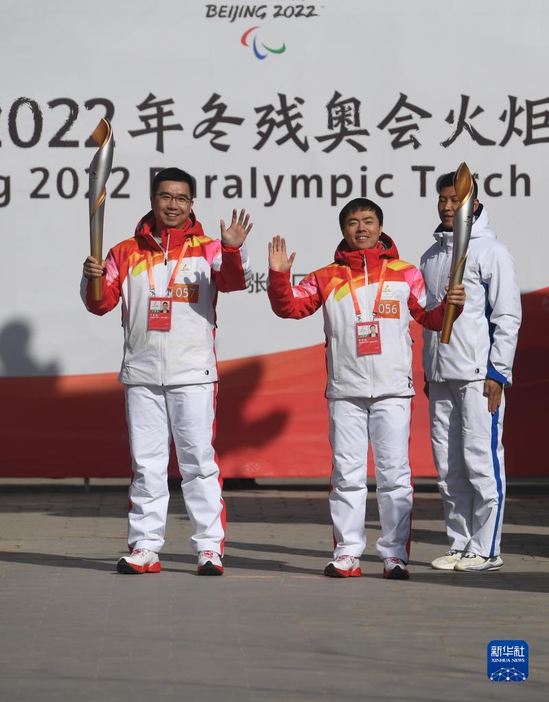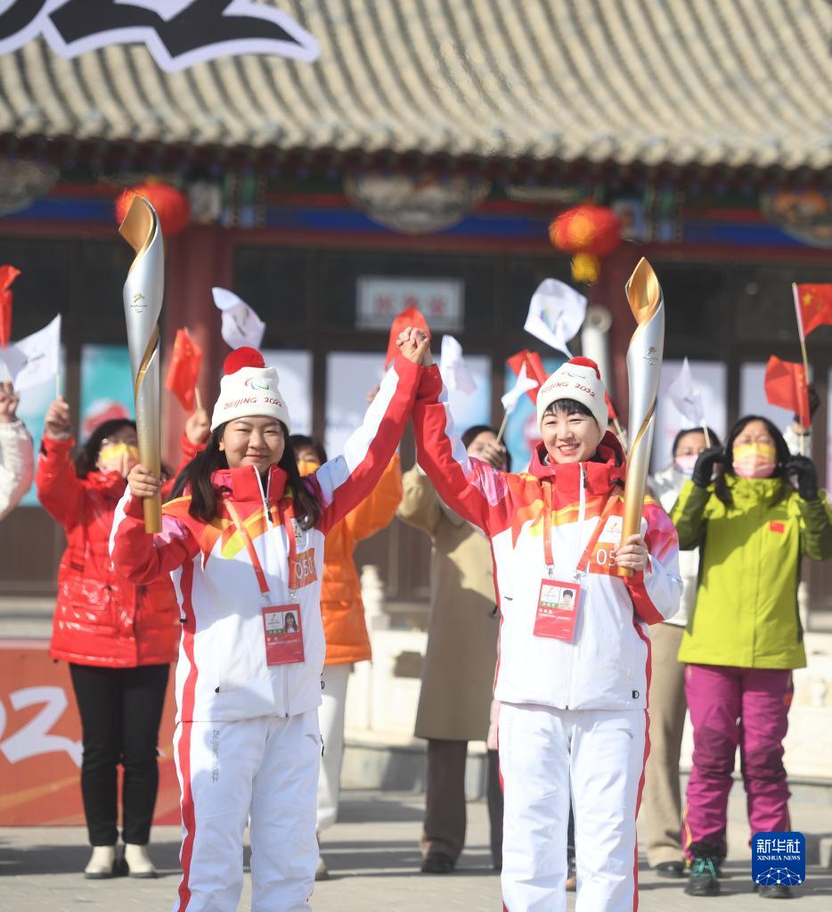 3月3日,火炬手王萧骁(左)和火炬手李哲浩在传递火炬。当日,北京冬残奥会火炬在蔚县暖泉古镇传递。北京2022年冬残奥会将于3月4日开幕。新华社记者 朱旭东 摄