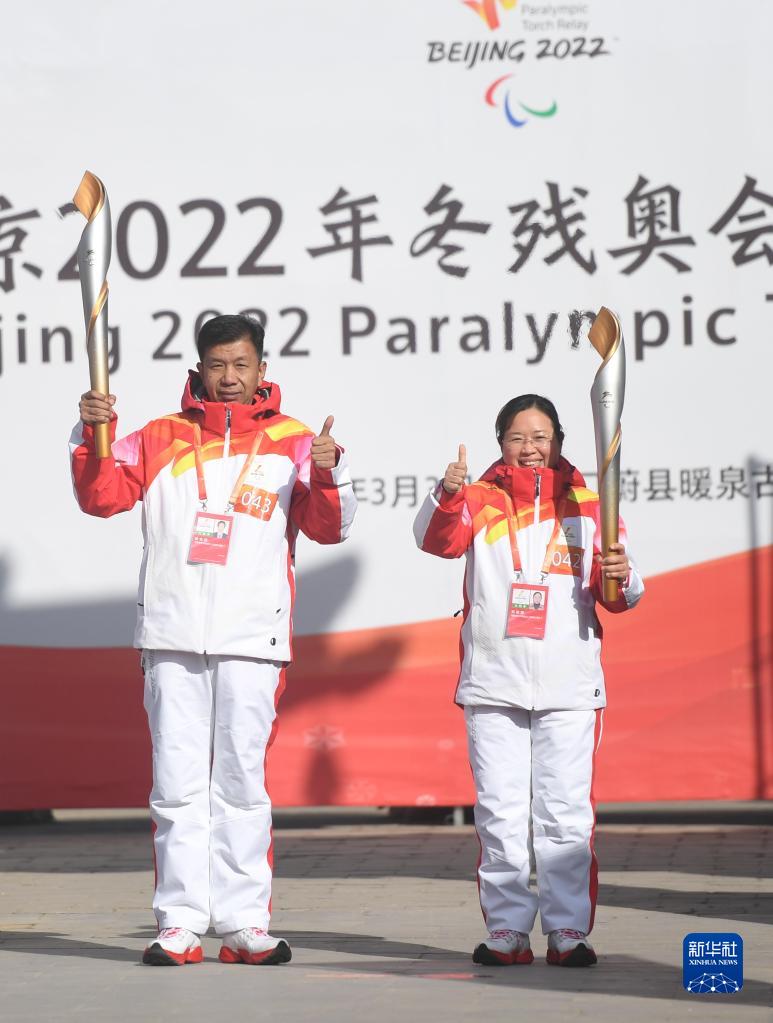 3月3日,火炬手高会民(左)和火炬手刘丽霞在传递火炬。新华社记者 朱旭东 摄