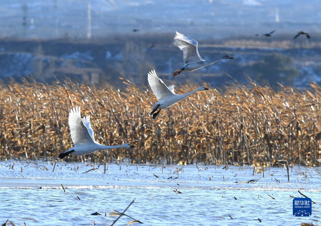 2021年11月13日,三只天鹅在怀来官厅水库湿地公园飞舞。新华社记者杨世尧摄