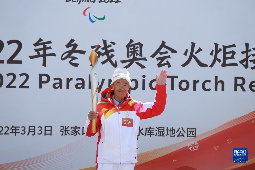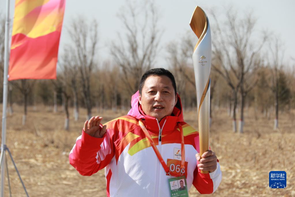 3月3日,北京冬残奥会火炬手郭万刚在怀来官厅水库国家湿地公园传递火炬。新华社记者赵鸿宇摄
