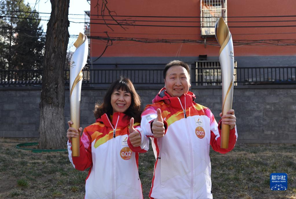3月2日,第一棒火炬手朱鹏凯(右)与第二棒火炬手周述娜在城市火种火炬传递中交接。新华社记者陶希夷摄