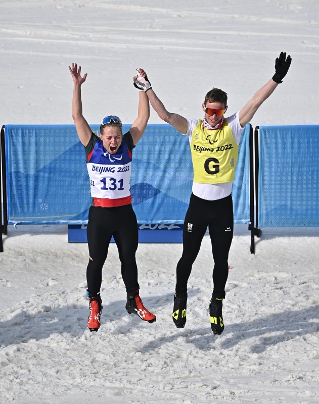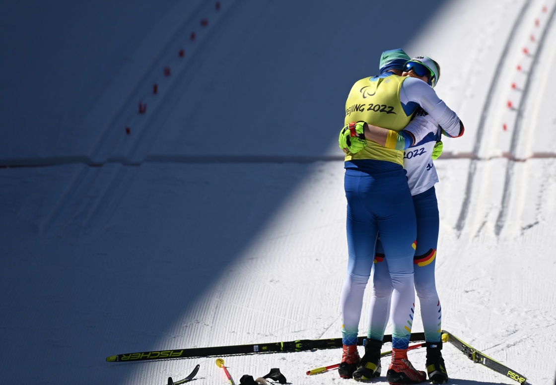 在残奥越野滑雪女子长距离传统技术(视障)比赛后,德国选手林·卡茨迈尔(右)和引导员弗洛里安·鲍曼拥抱庆祝完赛(3月7日摄)。新华社记者 赵子硕 摄