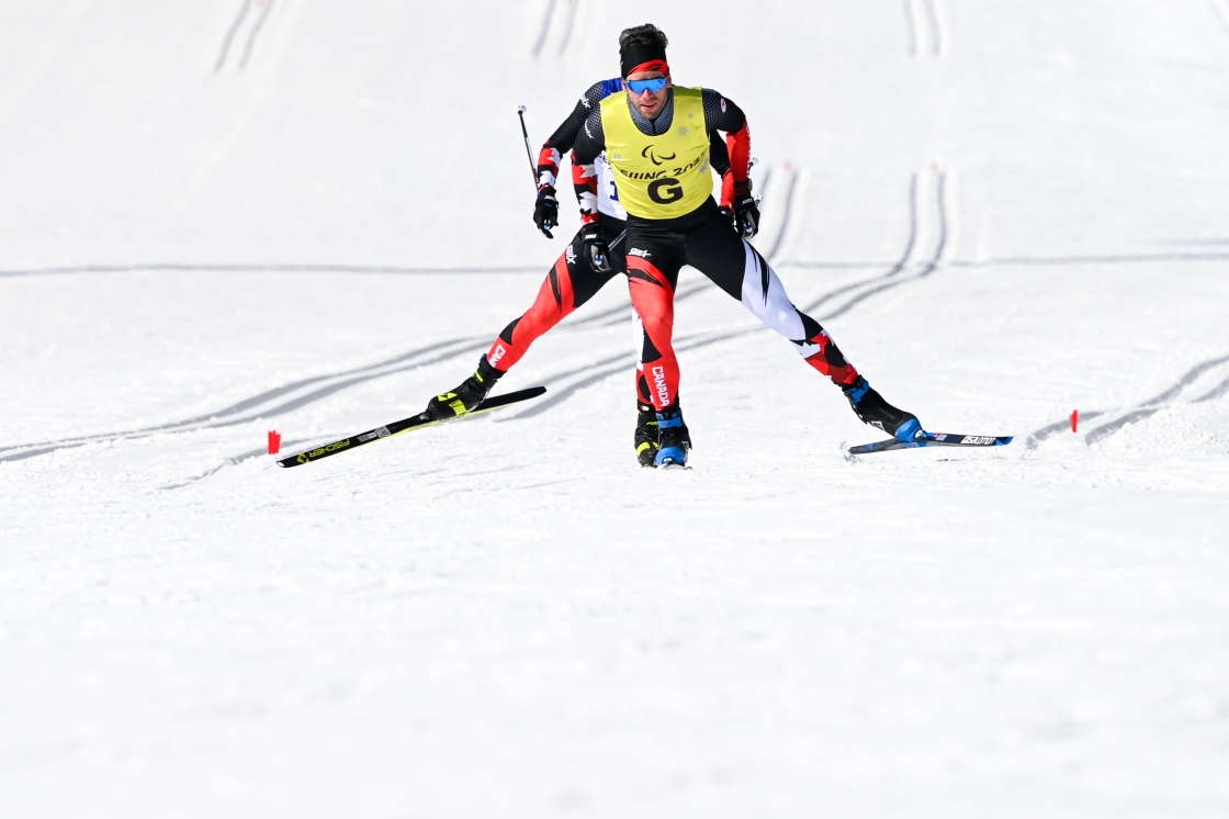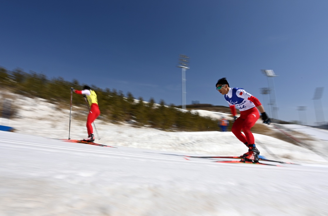 加拿大选手布赖恩·麦基弗和引导员拉塞尔·肯尼迪(前)在残奥越野滑雪男子短距离自由技术(视障)资格赛中(3月9日摄)。新华社记者 李博 摄
