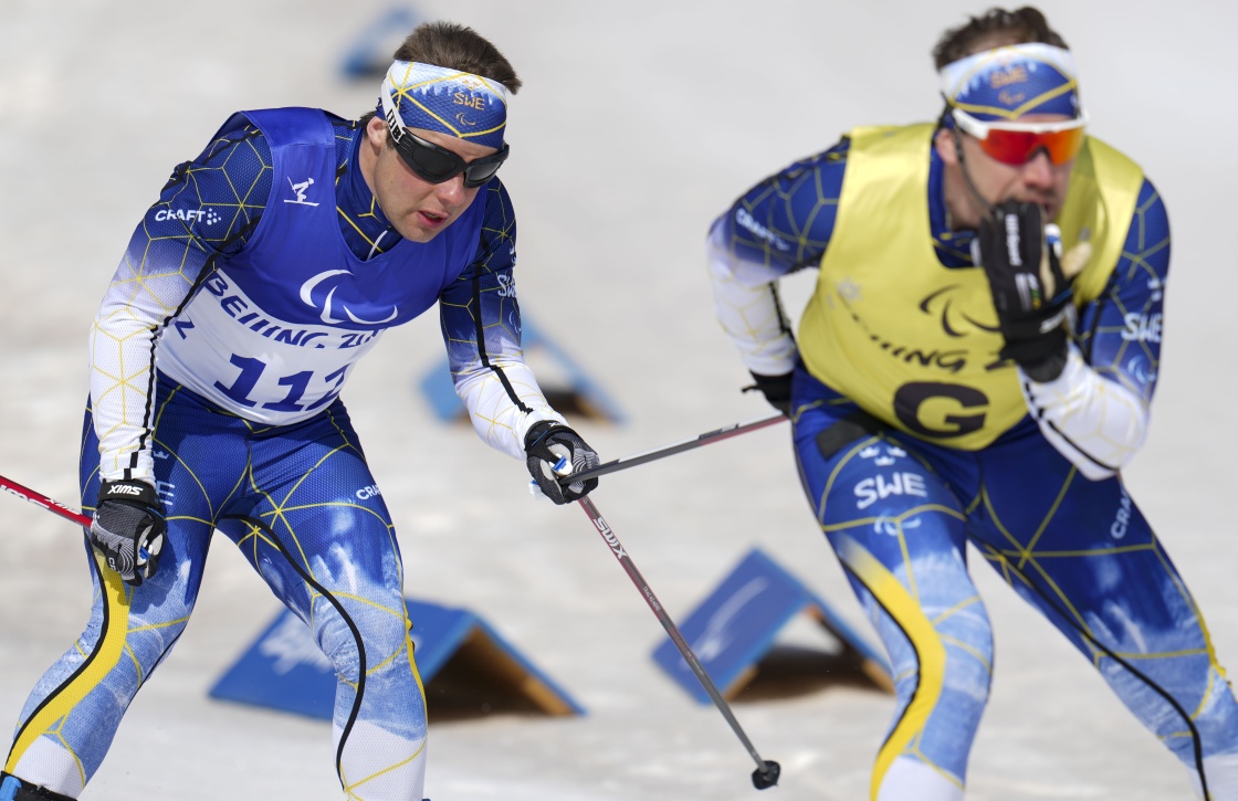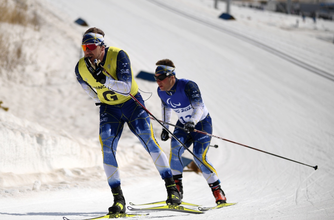 在残奥越野滑雪男子短距离自由技术(视障)资格赛中,瑞典选手塞巴斯蒂安·莫丁(左)牵着引导员埃米尔·延松的雪杖滑行(3月9日摄)。新华社记者 胡虎虎 摄
