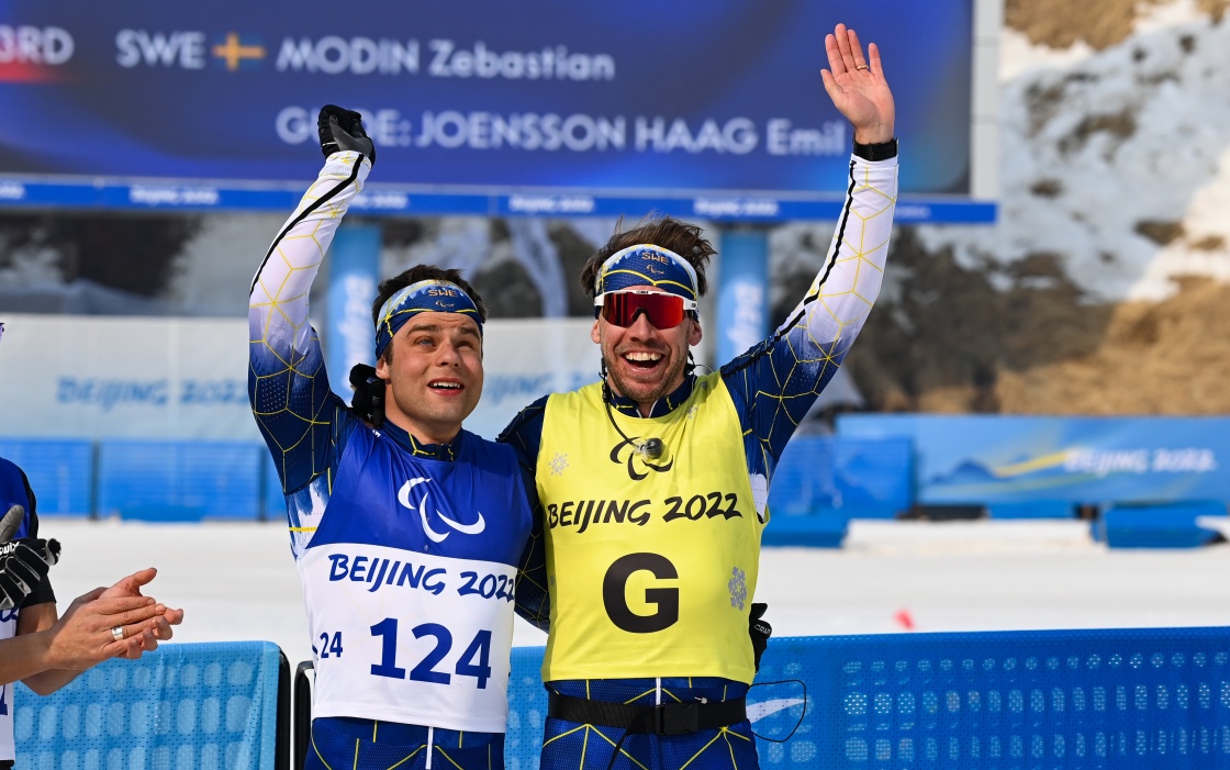 在残奥越野滑雪男子短距离自由技术(视障)比赛后,季军瑞典选手塞巴斯蒂安·莫丁(左)和引导员埃米尔·延松向现场观众致意(3月9日摄)。新华社记者 杨冠宇 摄