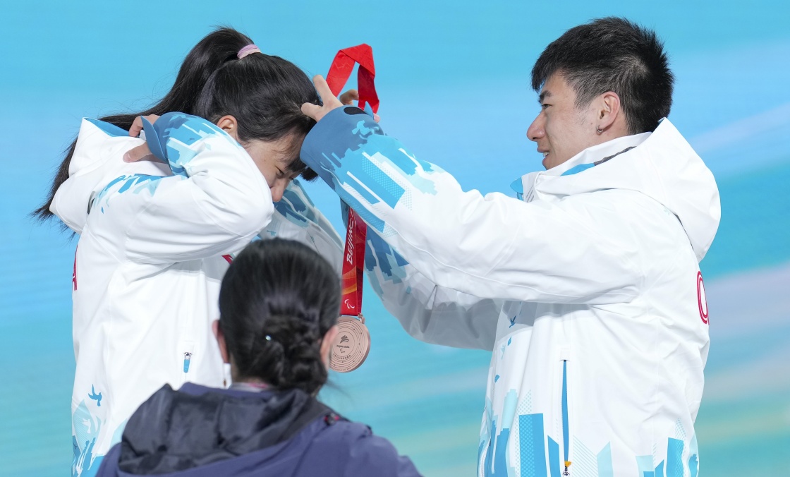 在残奥冬季两项女子中距离(视障)比赛奖牌颁发仪式上,引导员李亚林(右)为中国选手王跃佩戴奖牌(3月8日摄)。新华社记者 胡虎虎 摄