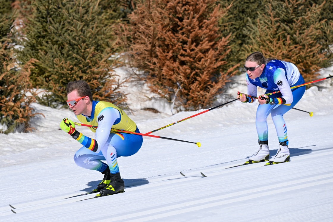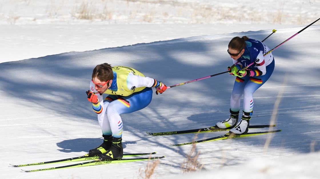 德国选手莱奥妮·玛丽亚·瓦尔特(右)和引导员皮尔明·施特雷克尔在残奥越野滑雪女子长距离传统技术(视障)比赛中(3月7日摄)。新华社记者 李博 摄