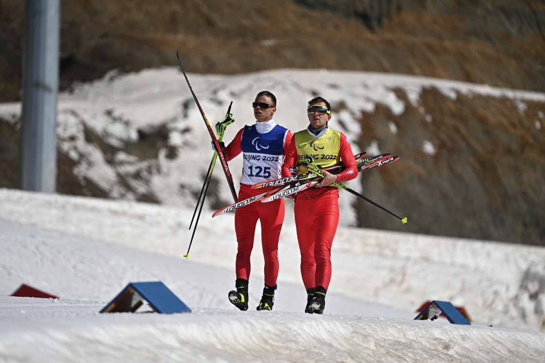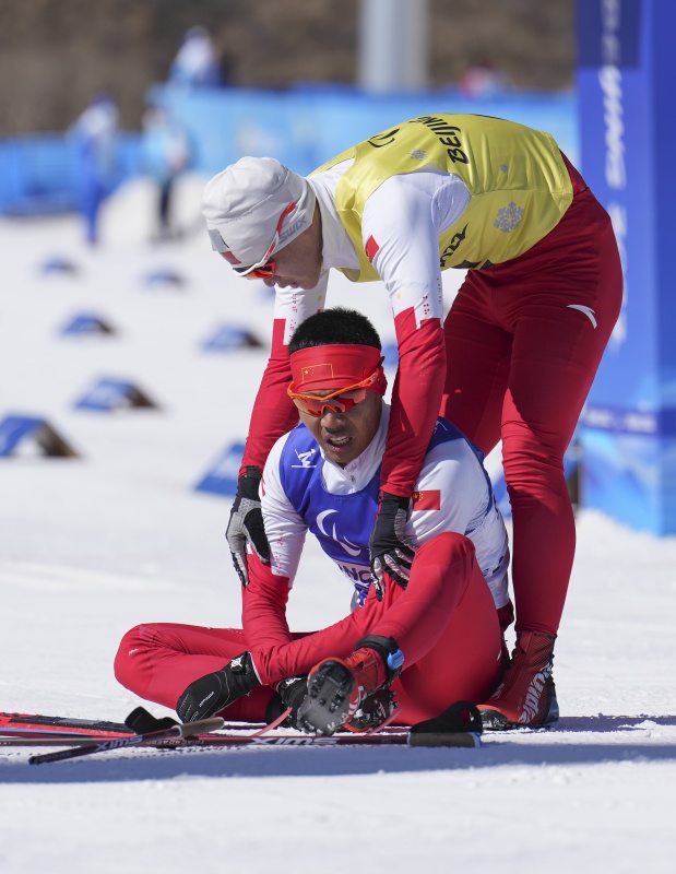未能完赛的波兰选手帕维尔·诺维茨基(左)与领滑员扬·科布林在残奥越野滑雪男子短距离自由技术(视障)资格赛后(3月9日摄)。新华社记者 侯昭康 摄