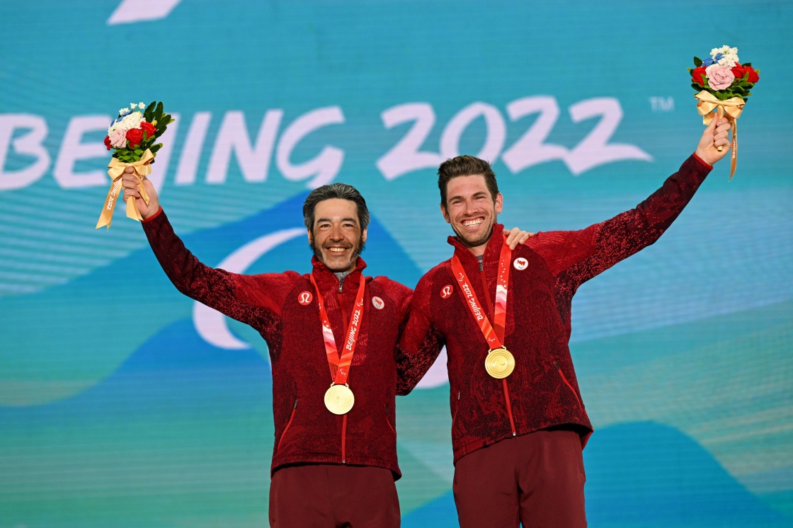 获得冠军的加拿大选手布赖恩·麦基弗(左)和引导员拉塞尔·肯尼迪一起出席残奥越野滑雪男子长距离传统技术(视障)奖牌颁发仪式(3月7日摄)。新华社记者 胡超 摄