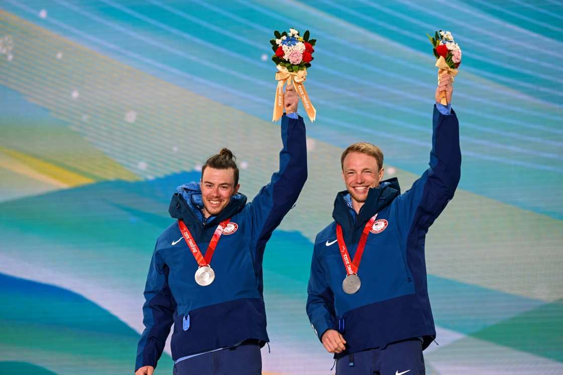 获得亚军的美国选手杰克·阿迪科夫(左)和引导员萨姆·伍德一起出席残奥越野滑雪男子长距离传统技术(视障)奖牌颁发仪式(3月7日摄)。新华社记者 胡超 摄