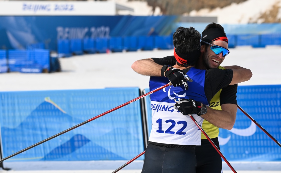 在残奥越野滑雪男子短距离自由技术(视障)比赛后,冠军加拿大选手布赖恩·麦基弗(前)与引导员拉塞尔·肯尼迪相拥庆祝(3月9日摄)。新华社记者 杨冠宇 摄