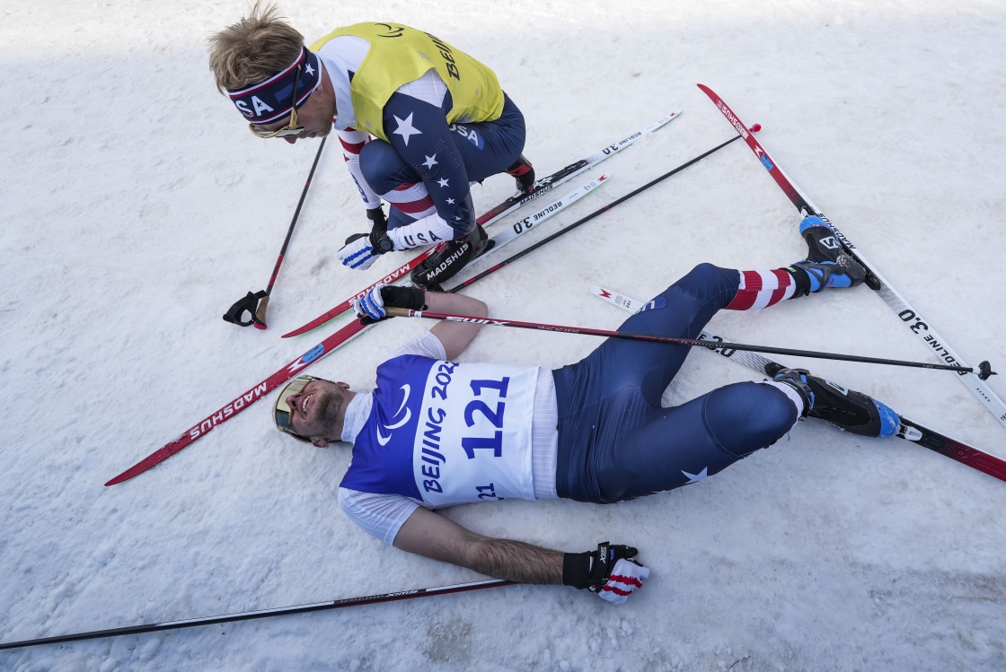 在残奥越野滑雪男子短距离自由技术(视障)决赛后,引导员萨姆·伍德(上)鼓励获得亚军的美国选手杰克·阿迪科夫(3月9日摄)。新华社记者 胡虎虎 摄