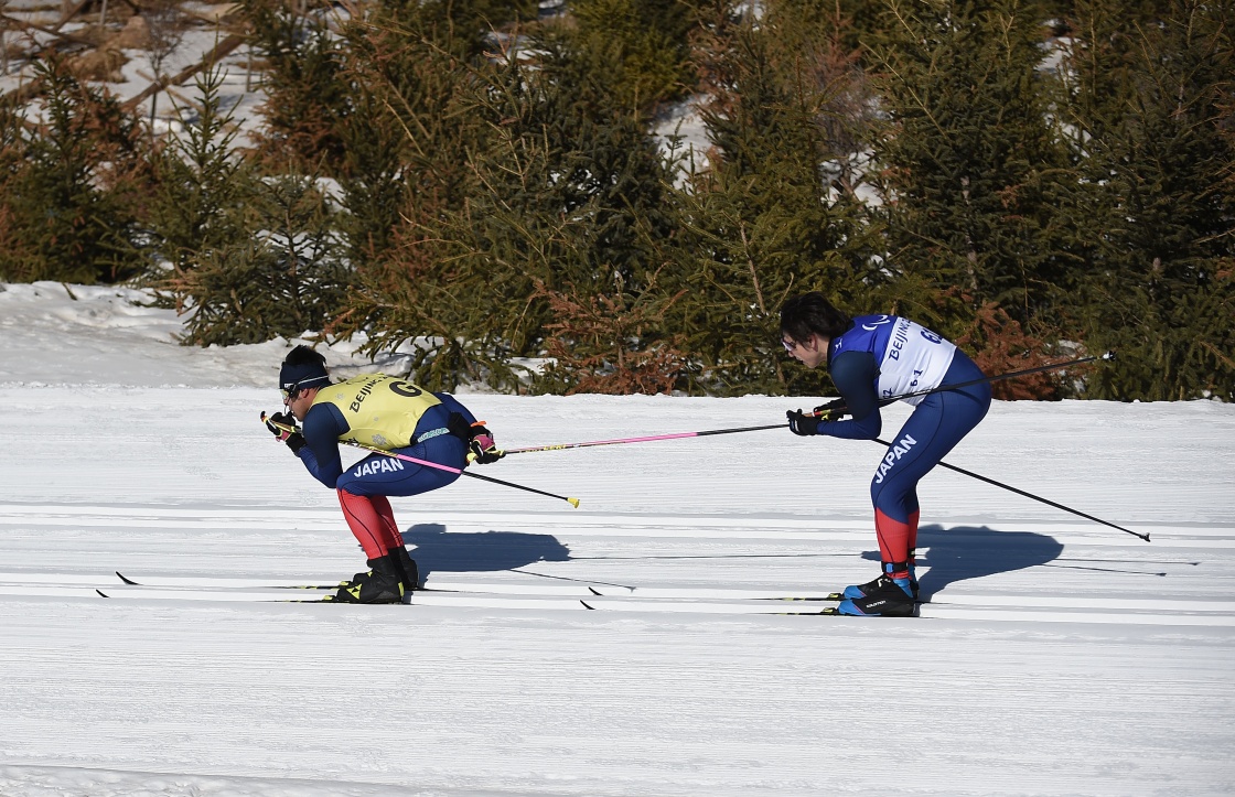 日本选手有安谅平(右)与引导员藤田佑平在残奥越野滑雪男子长距离传统技术(视障)比赛中(3月7日摄)。新华社记者 侯昭康 摄