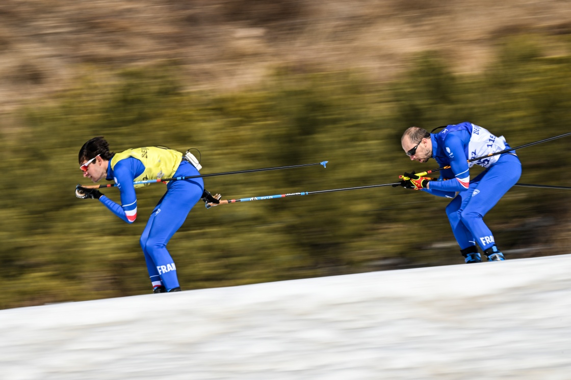 法国选手安东尼·沙朗松(右)和引导员布里斯·奥托内洛在残奥越野滑雪男子短距离自由技术(视障)资格赛中(3月9日摄)。新华社记者 李博 摄