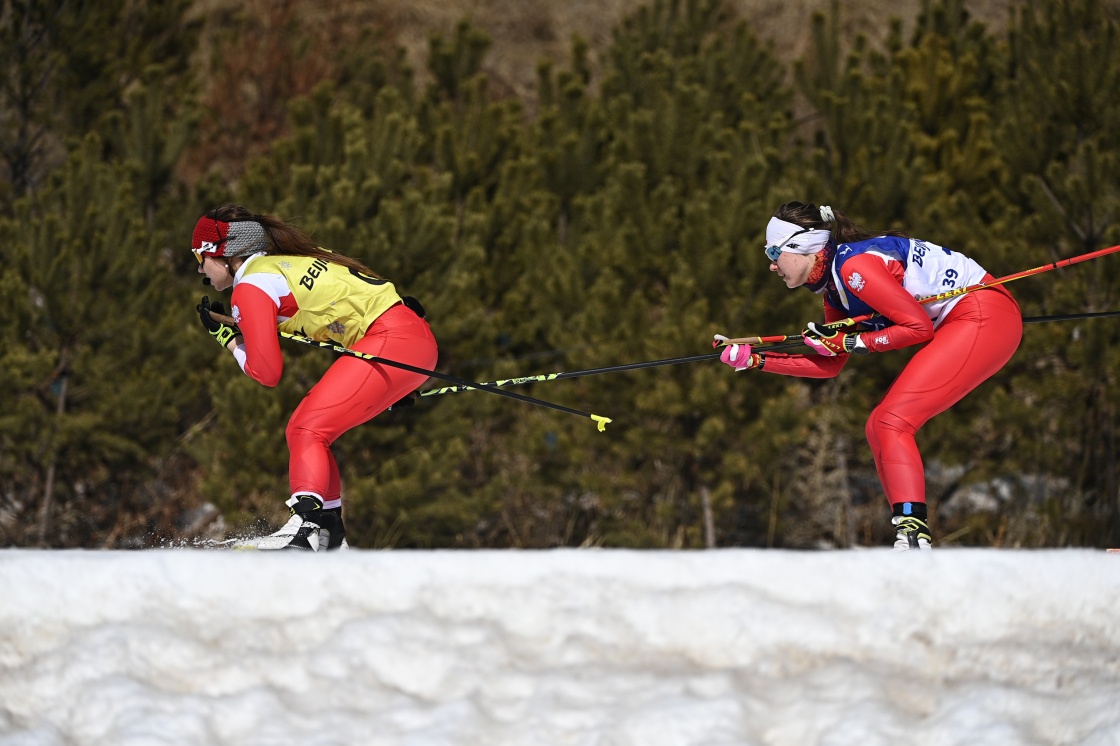 波兰选手阿妮塔·古尔斯卡(右)在残奥越野滑雪女子短距离自由技术(视障)资格赛中牵着引导员凯瑟琳·斯皮伦堡的雪杖滑行(3月9日摄)。新华社记者 侯昭康 摄