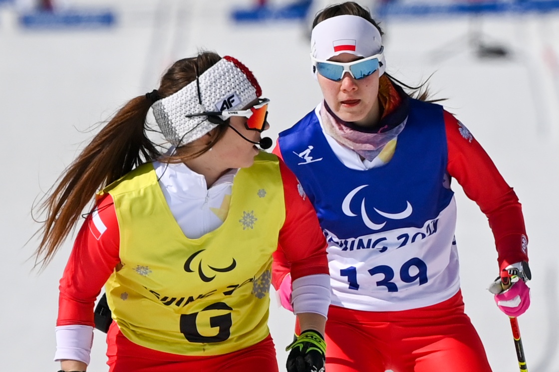 在残奥越野滑雪女子短距离自由技术(视障)资格赛中,波兰选手阿妮塔·古尔斯卡(后)在引导员凯瑟琳·斯皮伦堡的提示下滑行(3月9日摄)。新华社记者 李博 摄