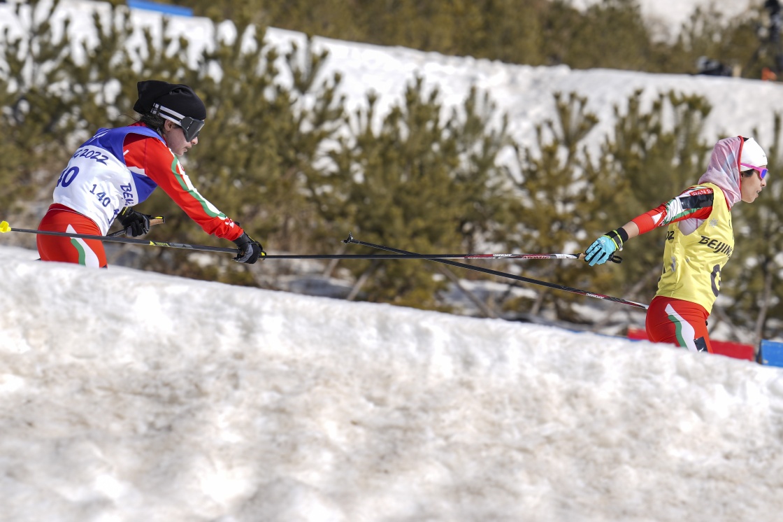 在残奥越野滑雪女子短距离自由技术(视障)资格赛中,伊朗选手埃拉赫·戈利法拉赫(左)和引导员法扎娜·礼萨苏尔塔尼在比赛中(3月9日摄)。新华社记者 胡虎虎 摄