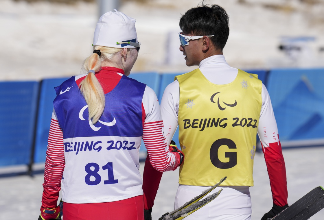在残奥冬季两项女子中距离(视障)比赛后,中国选手杨倩茹(左)挽着引导员于洪顺离开赛场(3月8日摄)。新华社记者 胡虎虎 摄