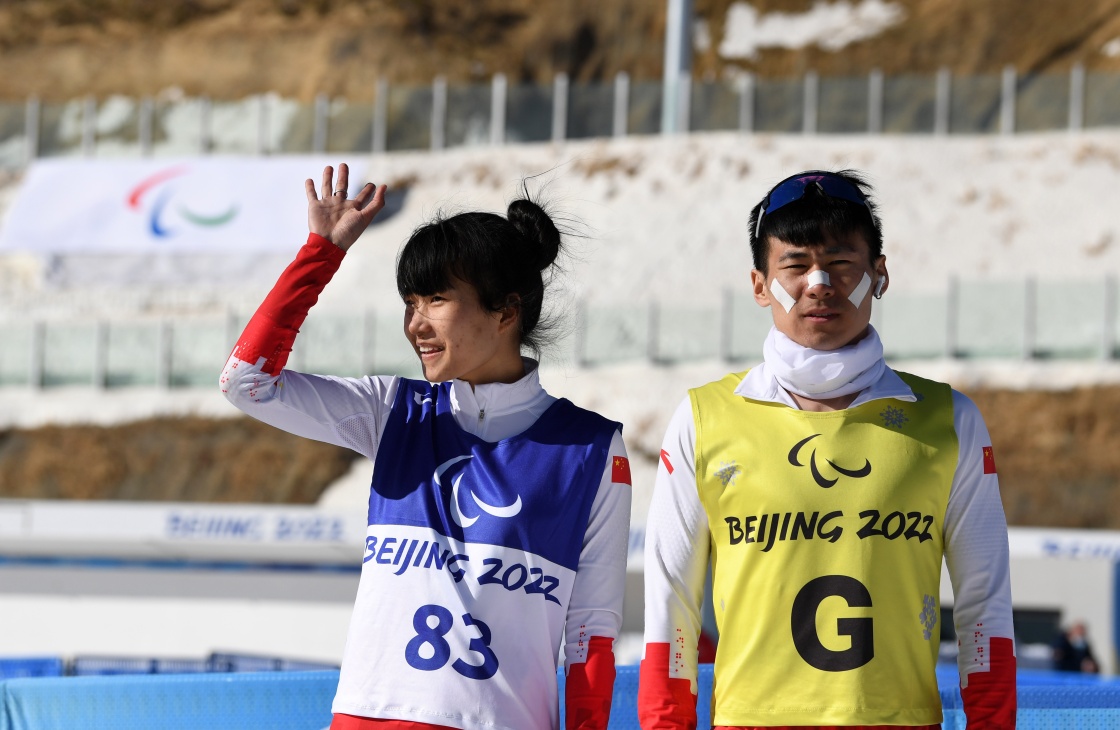 3月8日,在残奥冬季两项女子中距离(视障)比赛后,王跃(左)向现场观众致意。