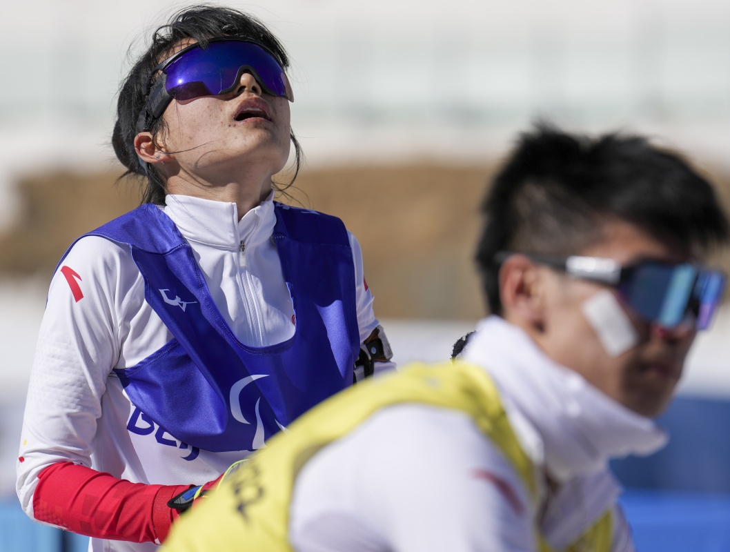 王跃在残奥越野滑雪女子长距离传统技术(视障)比赛后(3月7日摄)。新华社记者 胡虎虎 摄
