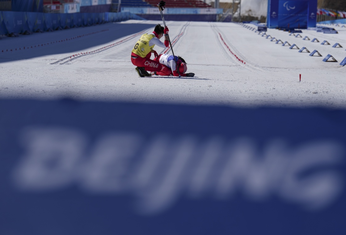 王跃(右)在残奥越野滑雪女子长距离传统技术(视障)比赛后累倒在地,引导员李亚林在一旁陪伴(3月7日摄)。新华社记者 胡虎虎 摄