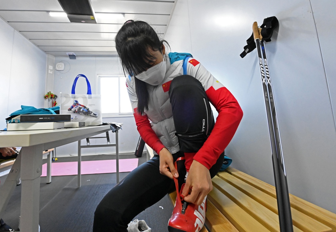 残奥越野滑雪女子长距离传统技术(视障)比赛前,王跃在国家冬季两项中心的打蜡房内整理装备(3月7日摄)。新华社记者 赵子硕 摄