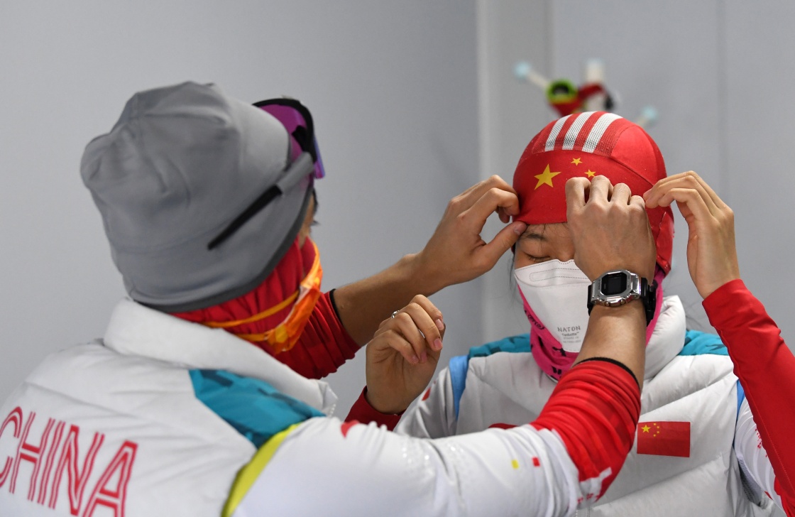 王跃的引导员李亚林帮助她在残奥越野滑雪女子长距离传统技术(视障)比赛前整理装备(3月7日摄)。新华社记者 赵子硕 摄
