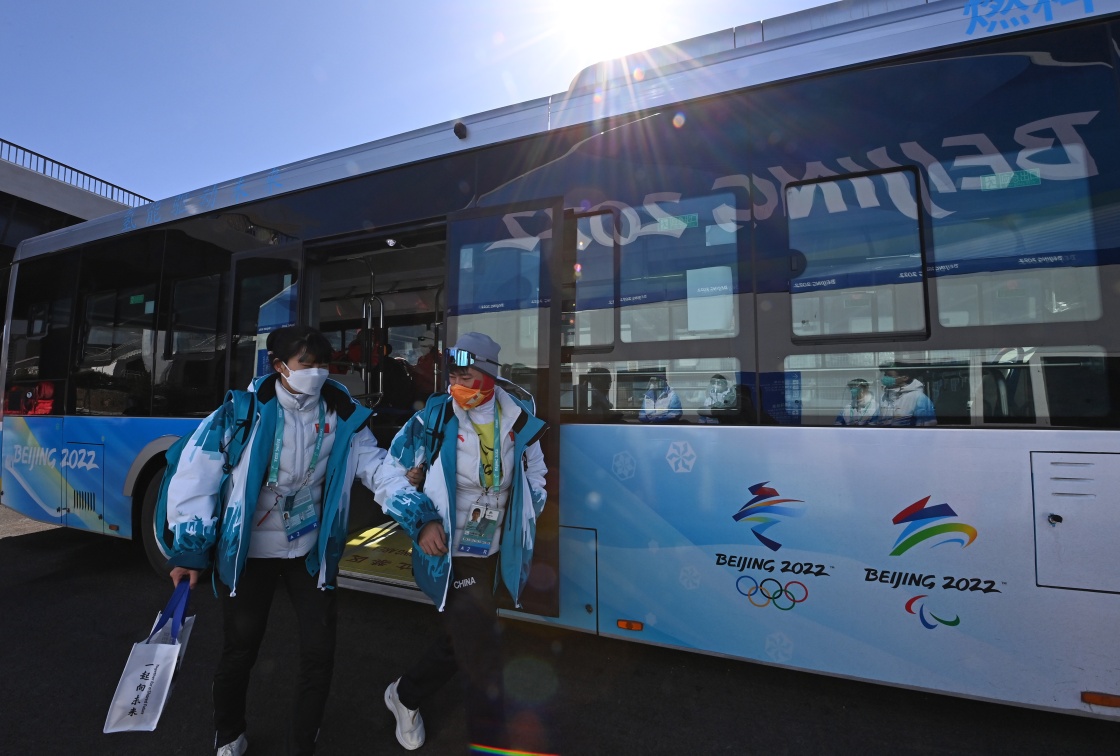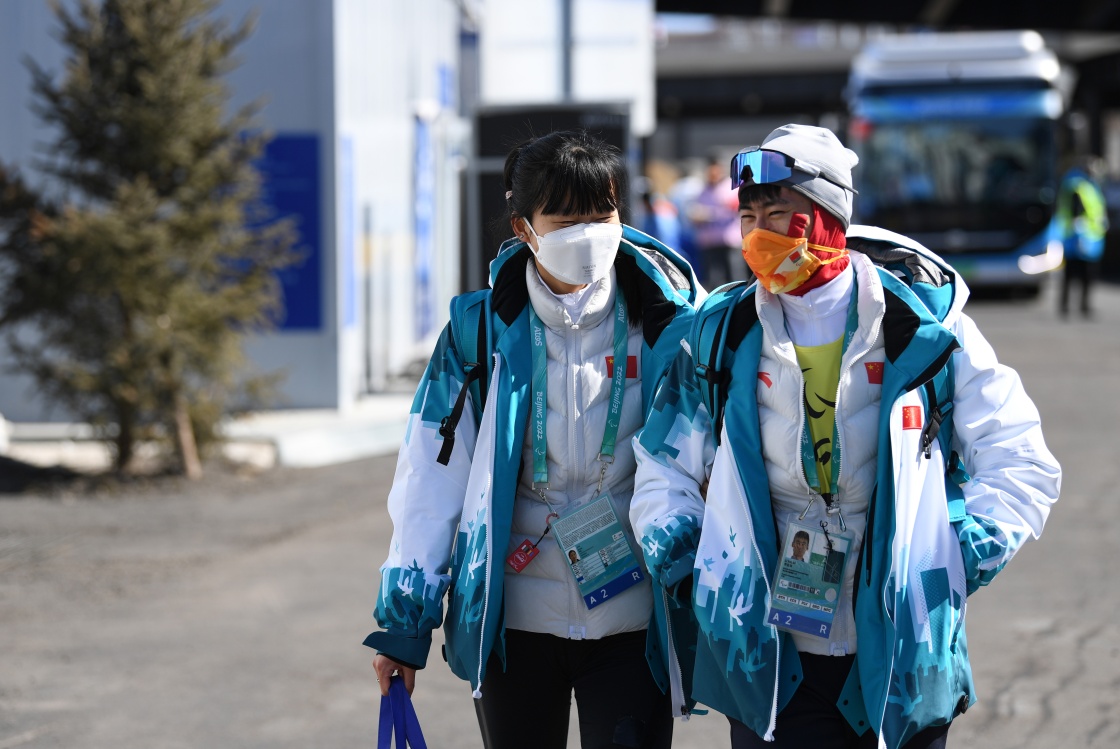 王跃(左)和她的引导员李亚林乘车抵达国家冬季两项中心(3月7日摄)。新华社记者 赵子硕 摄