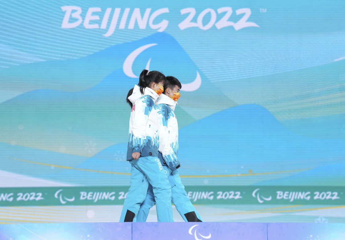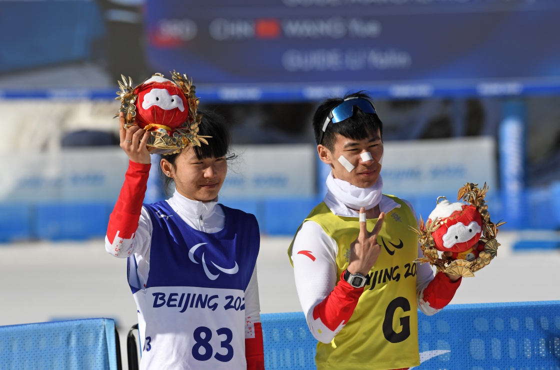 3月8日,王跃(左)和引导员李亚林参加残奥冬季两项女子中距离(视障)比赛颁奖仪式。新华社记者 胡虎虎 摄