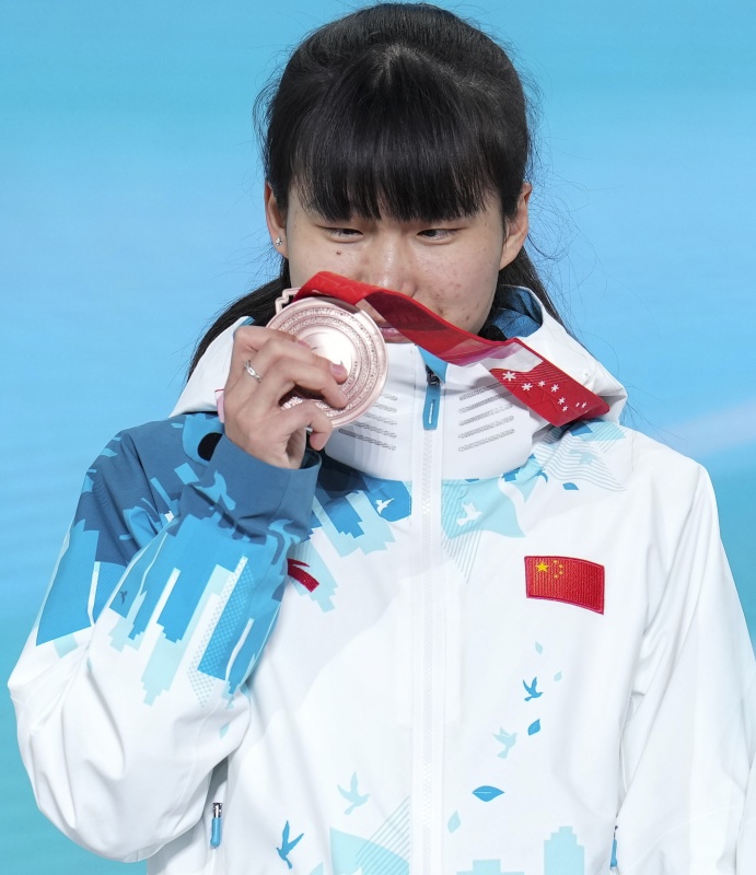 3月8日,在残奥冬季两项女子中距离(视障)比赛颁奖仪式上,王跃拿着奖牌仔细端详。新华社记者 胡虎虎 摄