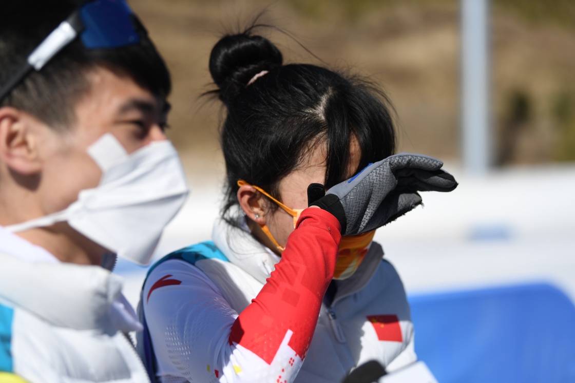 3月8日,王跃在残奥冬季两项女子中距离(视障)比赛后擦拭泪水。新华社记者 赵子硕 摄