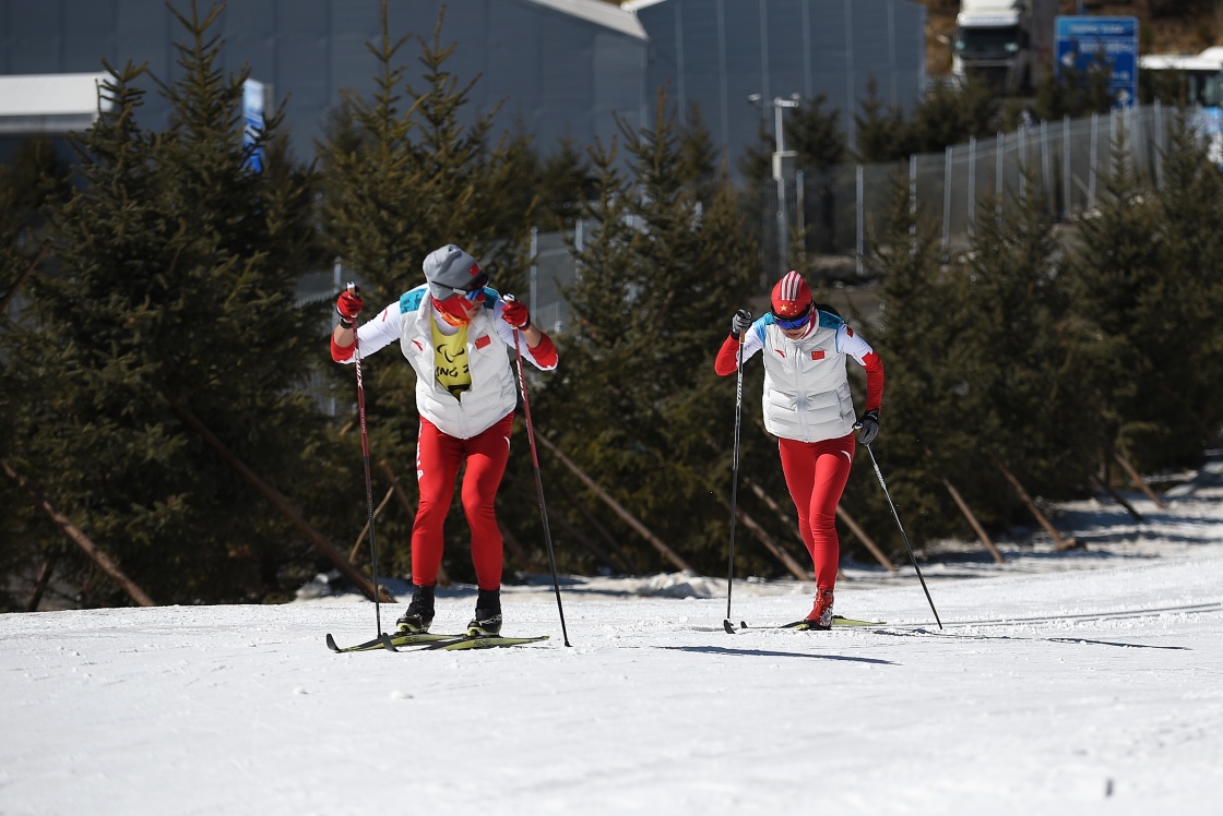 王跃(后)和引导员李亚林在残奥越野滑雪女子长距离传统技术(视障)比赛中(3月7日摄)。新华社记者 杨冠宇 摄