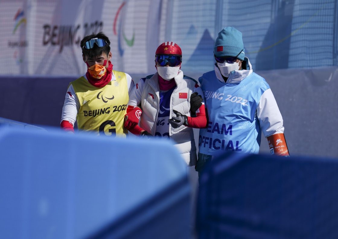 残奥越野滑雪女子长距离传统技术(视障)比赛后,王跃(中)在引导员李亚林和工作人员的帮助下离开比赛场地(3月7日摄)。新华社记者 胡虎虎 摄