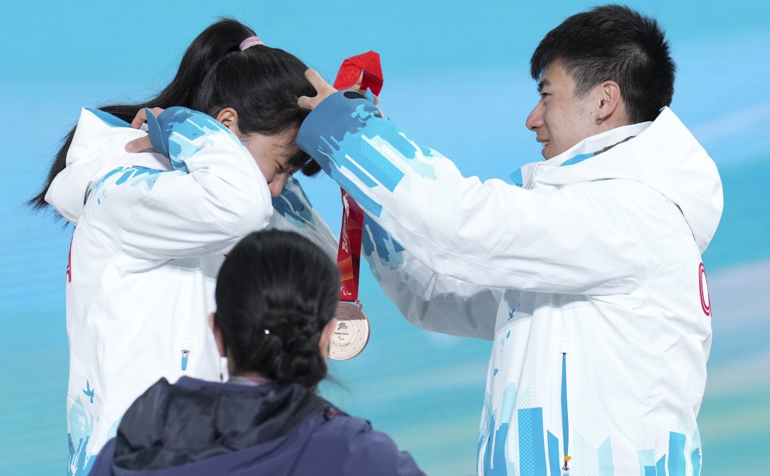 3月8日,在残奥冬季两项女子中距离(视障)比赛颁奖仪式上,引导员李亚林(右)为王跃佩戴奖牌。新华社记者 胡虎虎 摄
