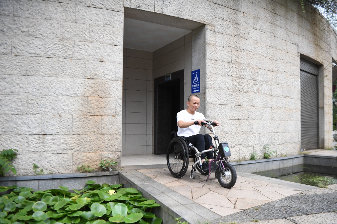 在湖南省长沙市湘府文化公园,刘毅坐电动轮椅车从无障碍洗手间出来(2021年8月25日摄)。新华社记者 薛宇舸 摄