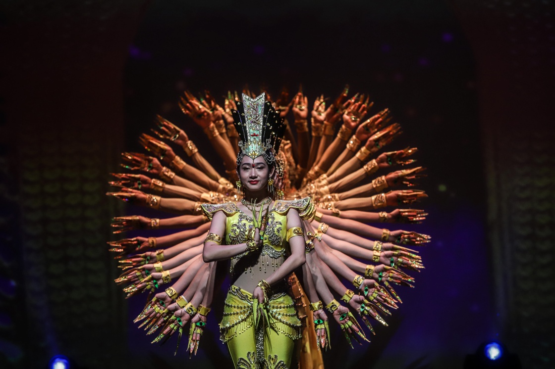 中国残疾人艺术团的演员在巴西圣保罗表演《千手观音》(2019年11月6日摄)。新华社发(拉赫尔·帕特拉索摄)