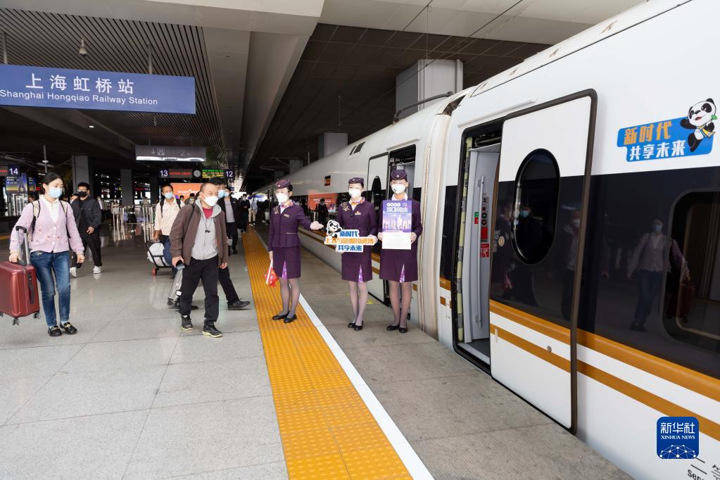 11月2日,在G1724次列车内,旅客与乘务人员为进博会送上祝福。