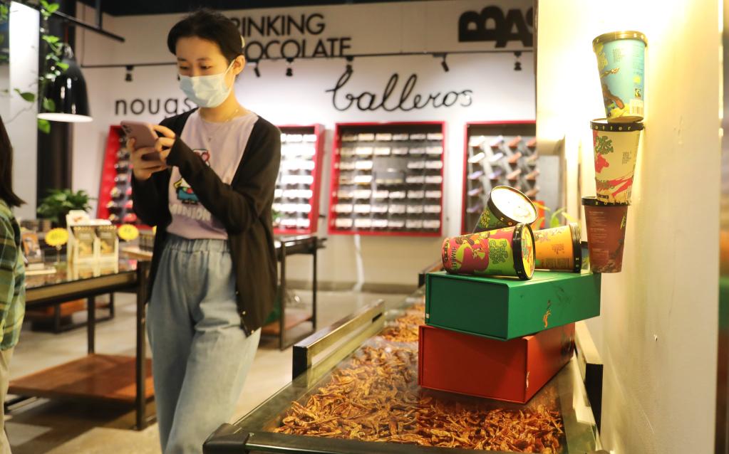 游客走在位于上海杨浦滨江的奥地利珍得巧克力剧院商店内(2022年9月24日摄)。在即将开幕的第五届进博会上,珍得巧克力除了扩大展位面积外,也将为中国市场带来更多全新口味的巧克力。新华社记者方喆 摄